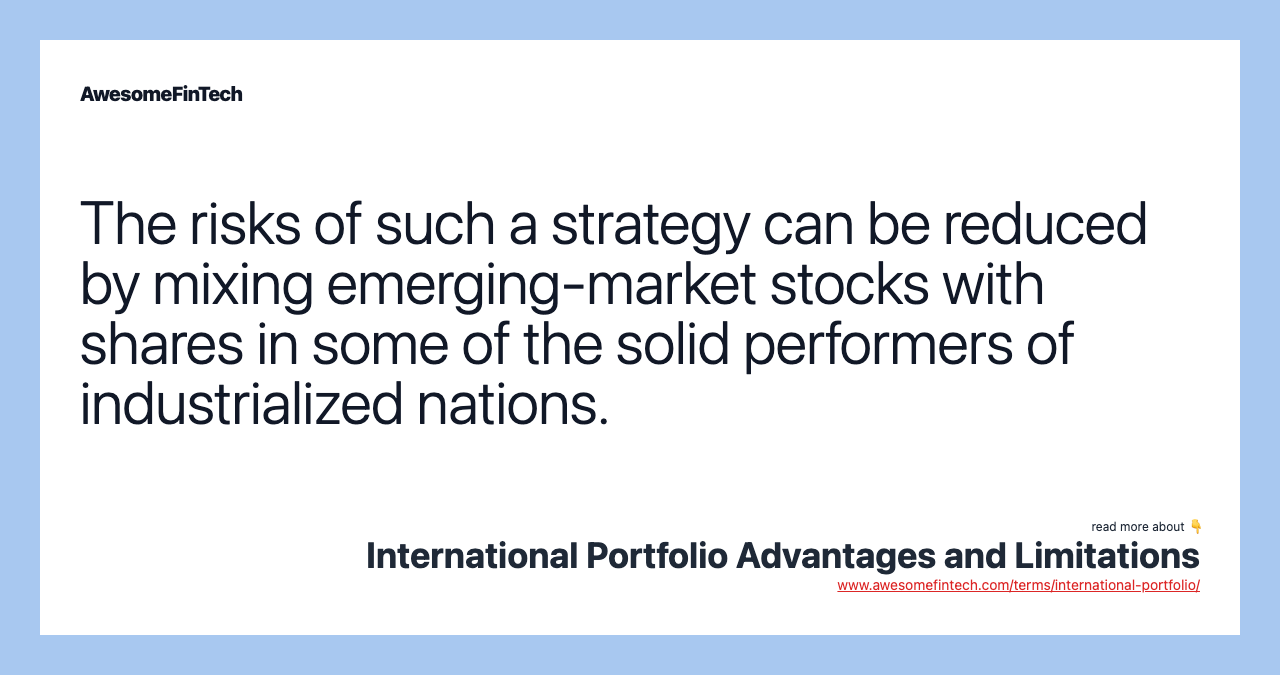 An international portfolio appeals to investors who want to diversify their assets by moving away from a domestic-only portfolio. This type of portfolio can carry increased risks due to potential economic and political instability in some emerging markets, There also is the risk that a foreign market's currency will slip in value against the U.S. dollar.