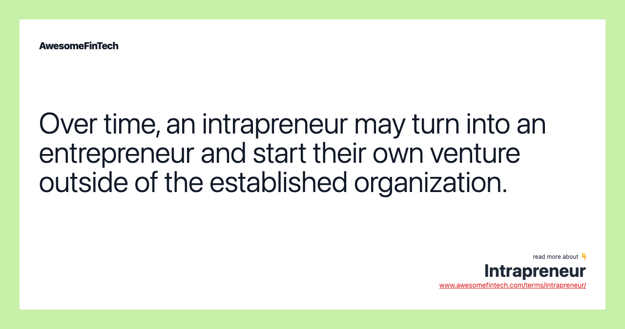 Intrapreneurs are high-performing employees who are typically assigned to explore new ways for a company to innovate, improve its existing products, or stay ahead of the competition. However, intrapreneurs are not always assigned this role and individuals with innovative ideas can also surface them or work on these projects on the side, before introducing them to senior leadership.