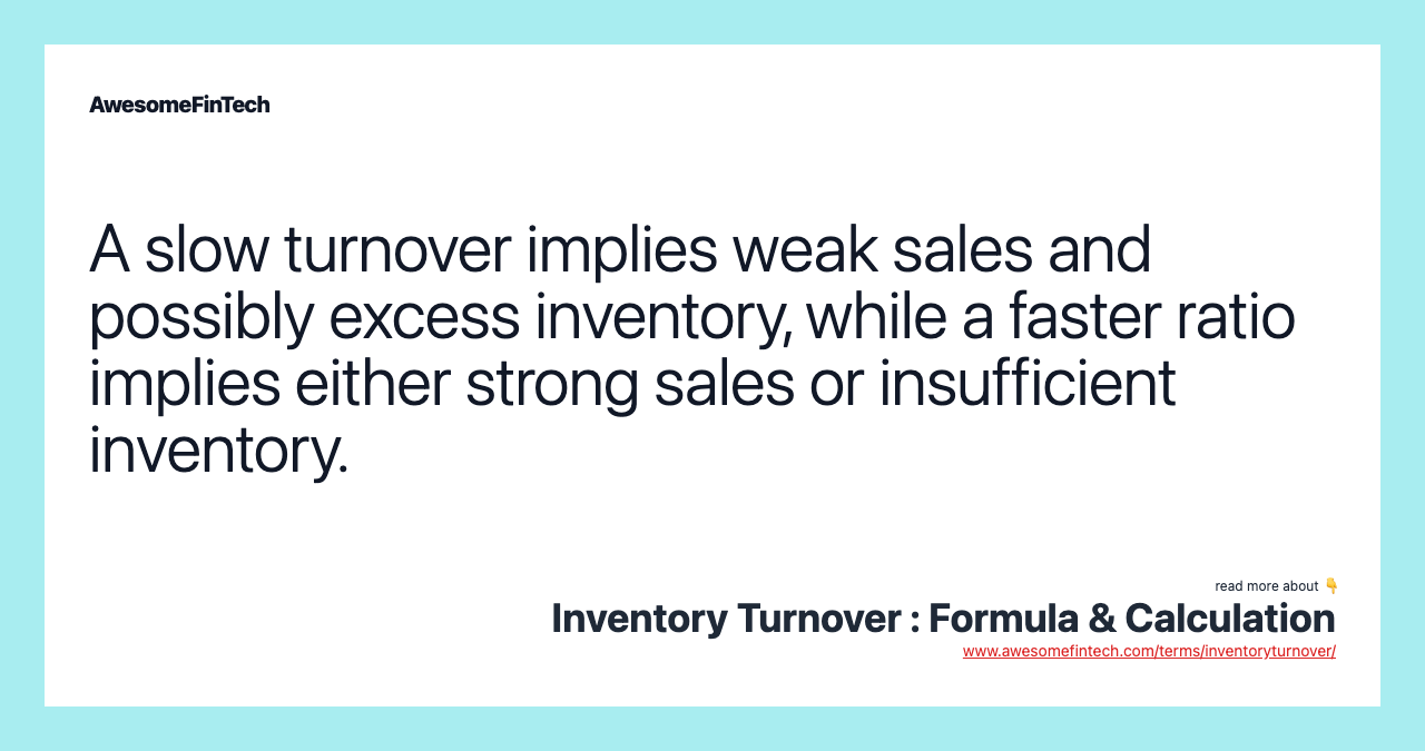 Inventory turnover measures how fast a company sells inventory. A low turnover implies weak sales and possibly excess inventory, also known as overstocking. It may indicate a problem with the goods being offered for sale or be a result of too little marketing.