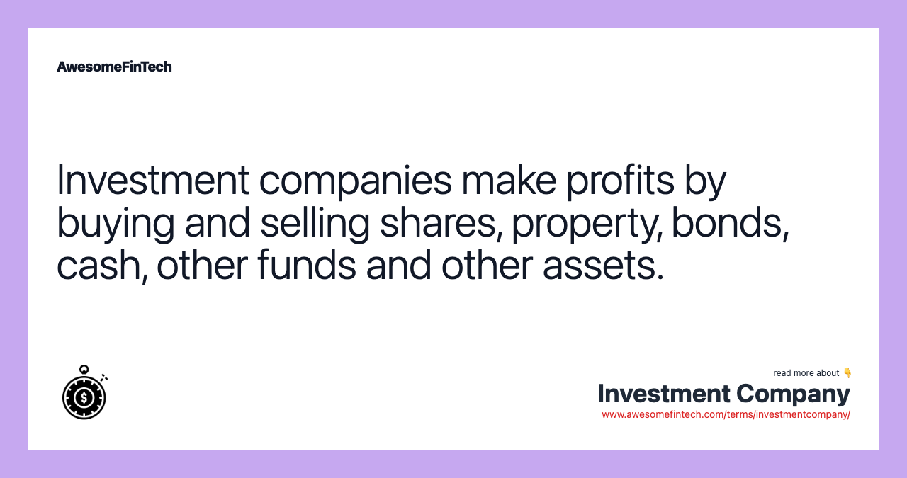 Investment companies make profits by buying and selling shares, property, bonds, cash, other funds and other assets. The portfolio that is created using the pool of funds is usually diversified and managed by an expert fund manager, who can choose to invest in specific markets, industries or even unlisted businesses that are at early stages in their development. In return, clients gain access to a wide array of investment products that they normally would not have been able to access. The success of the fund depends on how effective the manager’s strategy is. In addition, investors should be able to save on trading costs since the investment company is able to gain economies of scale in operations.