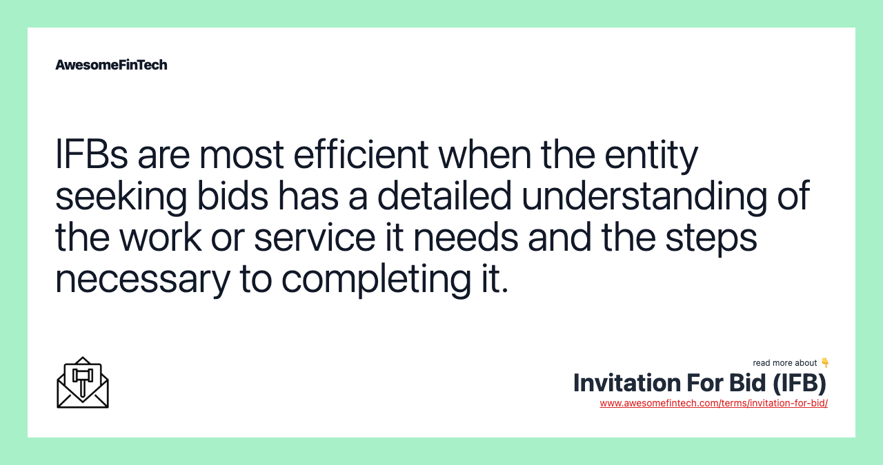 IFBs are most efficient when the entity seeking bids has a detailed understanding of the work or service needed and the steps necessary to completing it, leaving price as the major determining factor in choosing among providers.