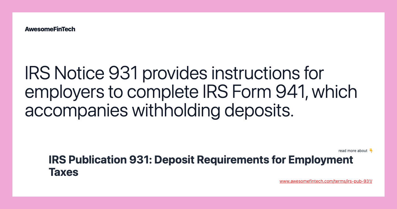 IRS Notice 931 is not a tax form but provides instructions for employers to complete IRS Form 941, which accompanies withholding deposits. Employer withholding of employment tax liabilities remains a bedrock principle of tax codes around the world since any system that relied on employees to make their own tax payments would inevitably result in missed payments and expensive collection efforts by the government.