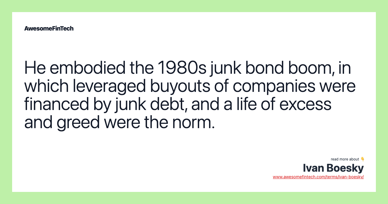 Ivan Boesky is a renowned American arbitrageur who came to epitomize the mantra "greed is good" during the financial excess of the 1980s. A major player in the hostile takeover and junk bond craze, his words partly inspired the fictional character Gordon Gekko in Oliver Stone's movie, Wall Street.