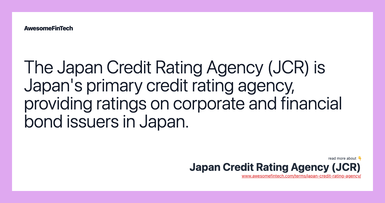 The Japan Credit Rating Agency (JCR) is a Japanese financial services company that provides credit ratings on the corporate debt of Japanese companies and foreign bond issuers. The entity also publishes a variety of financial and economic information and serves as a guide for counterparty credit risk.