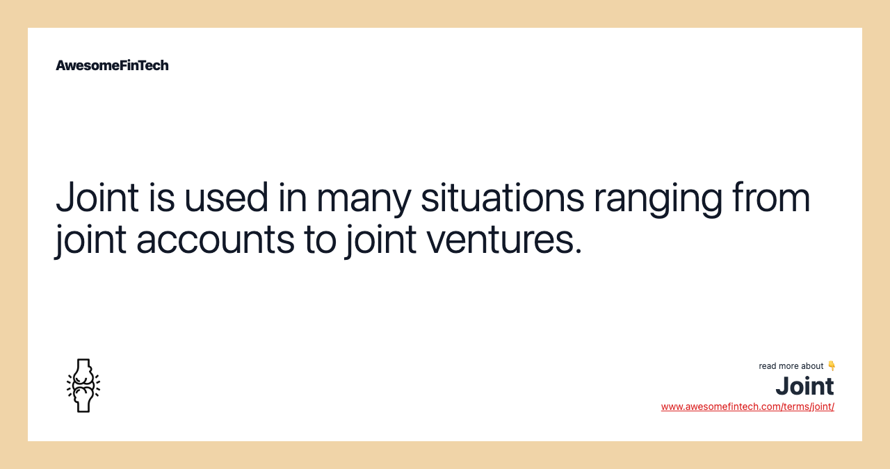 Joint is a legal term describing a transaction or agreement where two or more parties act in unison. Corporations, partnerships, limited liability companies (LLCs) and other business entities can all be involved in joint ventures, the agreements of which take into account: the number of parties involved, the scope in which the joint venture will operate, the terms of each party’s role and contribution, the ownership split, and how the joint ventures will be administered, managed and staffed. Joint, as a term, can be used in a variety of situations, including: joint accounts, where two or more parties share a single account, such as a bank or brokerage account. Joint is used in many situations ranging from joint accounts to joint ventures. Most joint accounts have rights of survivorship, which means that if one account holder dies, the other will automatically retain rights to the account funds.