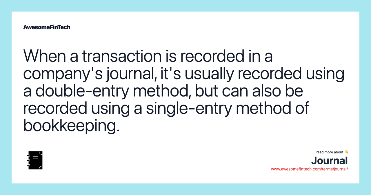 A journal is a detailed account that records all the financial transactions of a business, to be used for the future reconciling of accounts and the transfer of information to other official accounting records, such as the general ledger. When a transaction is recorded in a company's journal, it's usually recorded using a double-entry method, but can also be recorded using a single-entry method of bookkeeping. A journal is a detailed account that records all the financial transactions of a business, to be used for the future reconciling of accounts and the transfer of information to other official accounting records, such as the general ledger. For example, if a business owner purchases $1,000 worth of inventory with cash, the bookkeeper records two transactions in a journal entry. If, for example, a business owner purchases $1,000 worth of inventory with cash, the single-entry system records a $1,000 reduction in cash, with the total ending balance below it.