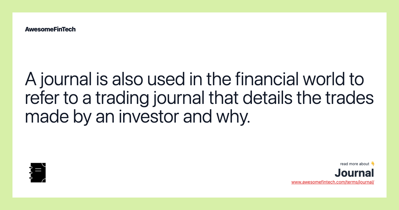 A journal is also used in the investment finance sector. For an individual investor or professional manager, a journal is a comprehensive and detailed record of trades occurring in the investor's own accounts, which is used for tax, evaluation, and auditing purposes.
