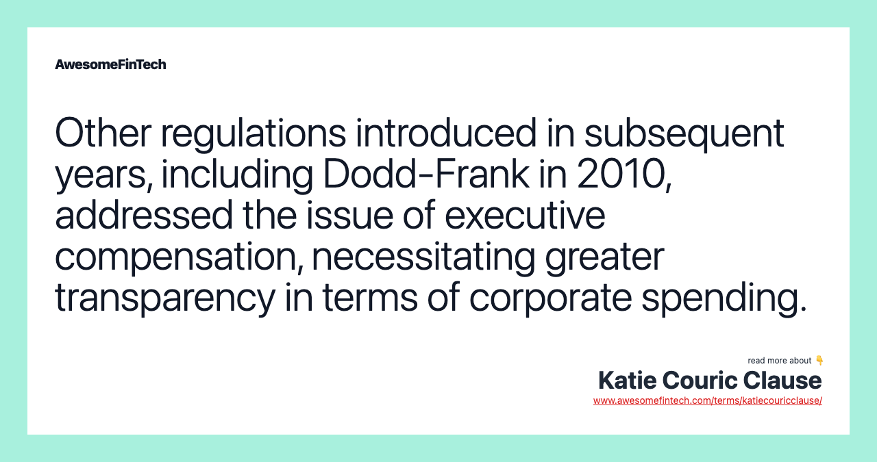 Table of Contents What Is the Katie Couric Clause? Understanding Katie Couric Clause Current SEC Compensation Rules Special Considerations The clause, which was ultimately not adopted, would have expanded on existing executive compensation rules, requiring companies to disclose the pay of up to three of the highest-paid non-executive employees at a company. The Katie Couric Clause was a slang term used to describe a proposed Securities and Exchange Commission rule regarding the disclosure of executive compensation and the compensation of other select employees. The Katie Couric Rule was not adopted by the SEC in 2006, but new regulations concerning the disclosure of information concerning executive compensation were required as a result of the 2010 Dodd-Frank financial reform legislation, which was enacted after the fallout from the 2008 credit crisis. If the Katie Couric clause had been adopted, companies would have had to disclose total compensation of up to three non-executive employees whose pay exceeds that of any of its top five managers.