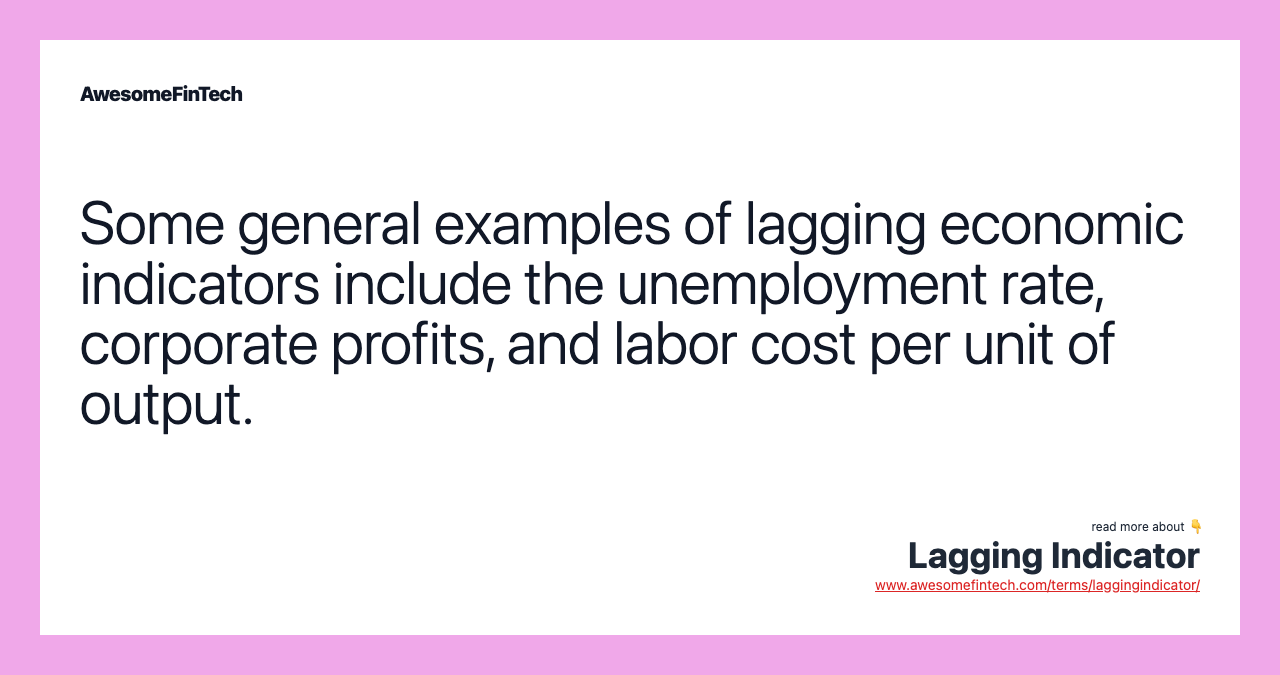 Some general examples of lagging indicators include the unemployment rate, corporate profits, and labor cost per unit of output. Interest rates can also be good lagging indicators since rates change as a reaction to severe movements in the market. Other lagging indicators are economic measurements, such as gross domestic product (GDP), the consumer price index (CPI), and the balance of trade (BOT).