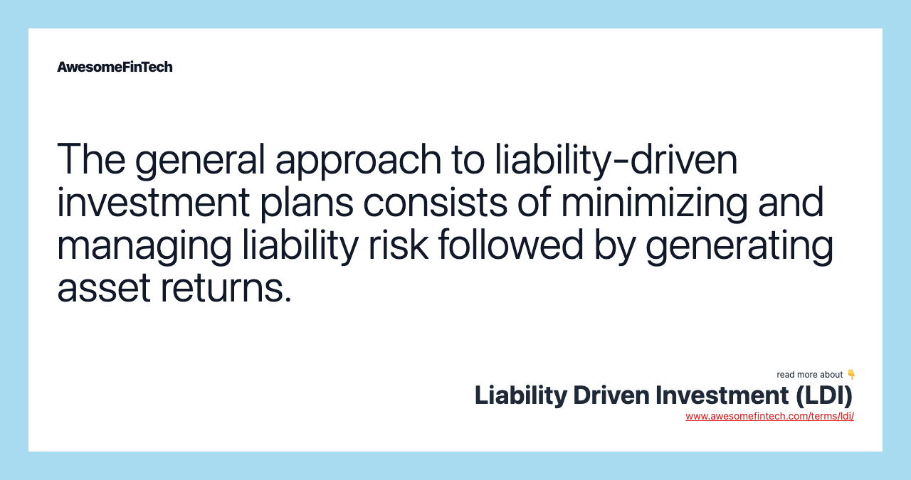 A liability-driven investment, otherwise known as liability-driven investing, is primarily slated toward gaining enough assets to cover all current and future liabilities. For a pension fund or pension plan that utilizes the LDI strategy, the focus must be placed on the pension fund’s assets. The first one is a defined-benefit income instrument for consistent returns (as a strategy to minimize liability risk) and the remaining amount goes into an equity instrument to generate returns from assets. Liability-driven investments are commonly used in defined-benefit pension plans or other fixed-income plans to cover current and future liabilities through asset acquisitions. Since the goal of an LDI strategy is to cover current and future liability risk, theoretically, it may be possible that the returns generated are moved into the fixed-income bucket over time.