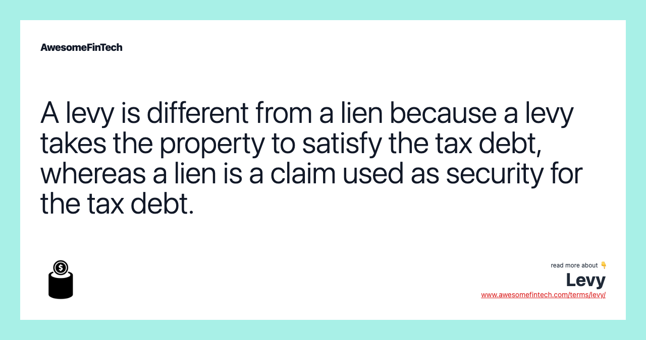 A levy is different from a lien because a levy takes the property to satisfy the tax debt, whereas a lien is a claim used as security for the tax debt. In other words, while a lien secures the government’s interest or claim to an individual’s or business’s property when the tax debt remains unpaid, a levy actually permits the government to seize and sell the property to pay the tax debt.