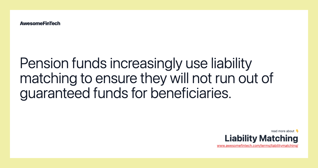 Liability matching is an investment strategy that matches future asset sales and income streams against the timing of expected future expenses. The strategy has become widely embraced among pension fund managers, who attempt to minimize a portfolio's liquidation risk by ensuring asset sales, interest, and dividend payments correspond with expected payments to pension recipients. This stands in contrast to simpler strategies that attempt to maximize return without regard to withdrawal timing.