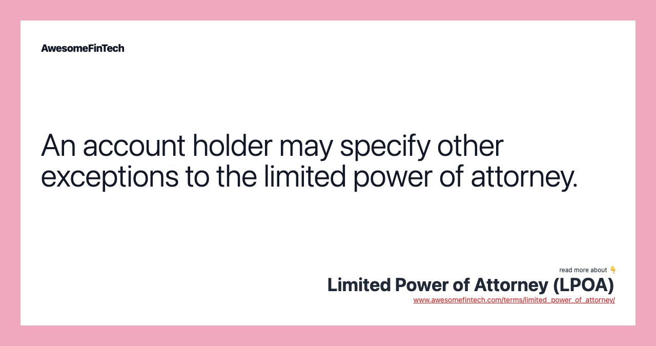 Limited Power of Attorney (LPOA) is an authorization that permits a portfolio manager to perform specific functions on behalf of the account owner. A limited power of attorney allows a portfolio manager to make routine decisions without contacting the account holder. Before signing an LPOA, the client should be aware of the specific functions they have delegated to the portfolio manager, as the client remains liable for the decisions. Limited Power of Attorney (LPOA) is an authorization that permits a portfolio manager to perform specific functions on behalf of the account owner. A limited power of attorney, as opposed to a general power of attorney, restricts the authority of the designated individual to a specific sphere.
