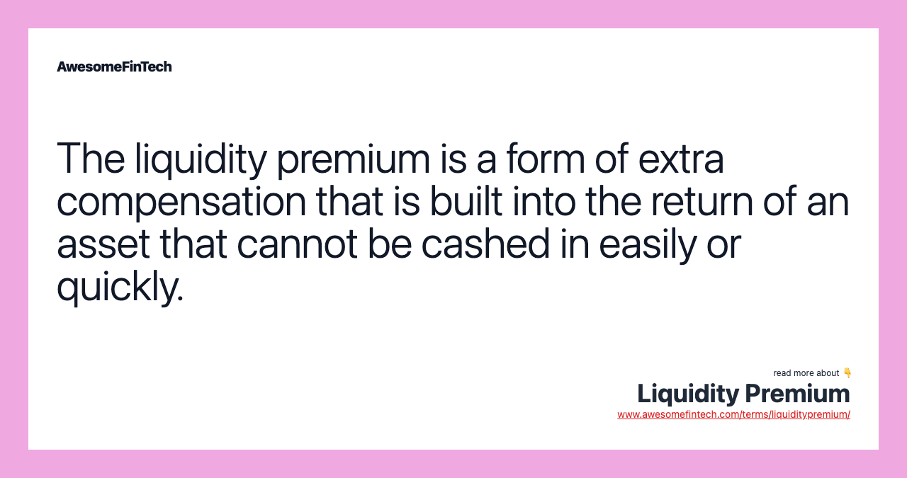 A liquidity premium is any form of additional compensation that is required to encourage investment in assets that cannot be easily and efficiently converted into cash at fair market value.