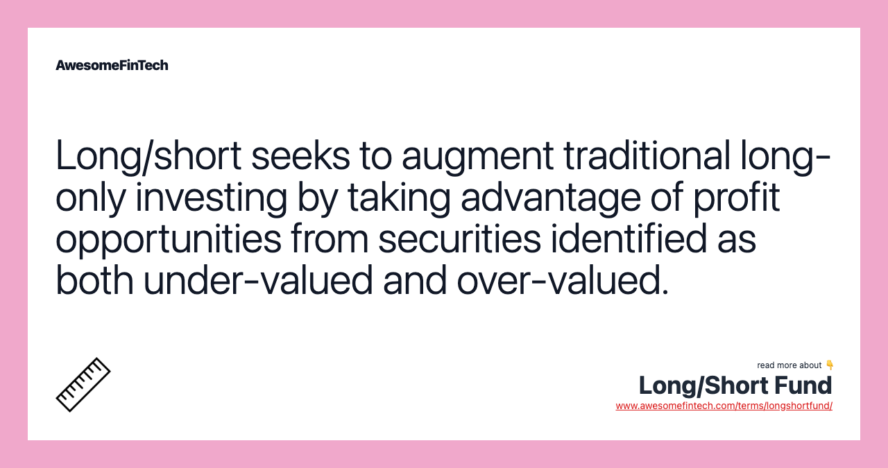 A long/short fund is a type of mutual fund or hedge fund that takes both long and short positions in investments typically from a specific market segment. Long/short equity is commonly used by hedge funds, which often take a relative long bias — for instance, a 130/30 strategy where long exposure is 130% of AUM and 30% is short exposure. Long/short funds typically seek to enhance the returns from investing in a specific market segment by actively taking both long and short positions in securities. A long/short fund is a type of mutual fund or hedge fund that takes both long and short positions in investments typically from a specific market segment. Long/short funds use an investment strategy that seeks to take a long position in underpriced stocks while selling short overpriced shares. Long/short funds are more closely regulated than hedge funds therefore they have limitations on the use of leverage and derivatives where hedge funds do not.