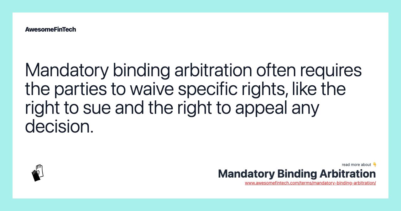 Mandatory binding arbitration often requires the parties to waive specific rights. Specifically, the provision in a contract removes or limits a party from suing if they feel wronged — they must go to arbitration instead. It also takes away their right to appeal any decision. By its binding nature, the proceeding means the arbiter’s judgment is a final one.