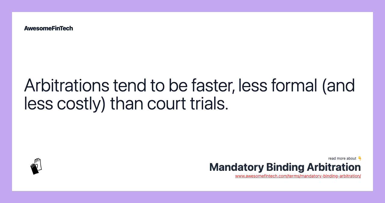 As a relatively informal proceeding, arbitration can indeed be faster and cheaper than a lawsuit to resolve contract disputes and differences. However, there do not seem to be many advantages to mandatory binding arbitration for individuals. Any issue they have might be better solved in open court, where the arbiters are truly impartial, and an appeals process exists.