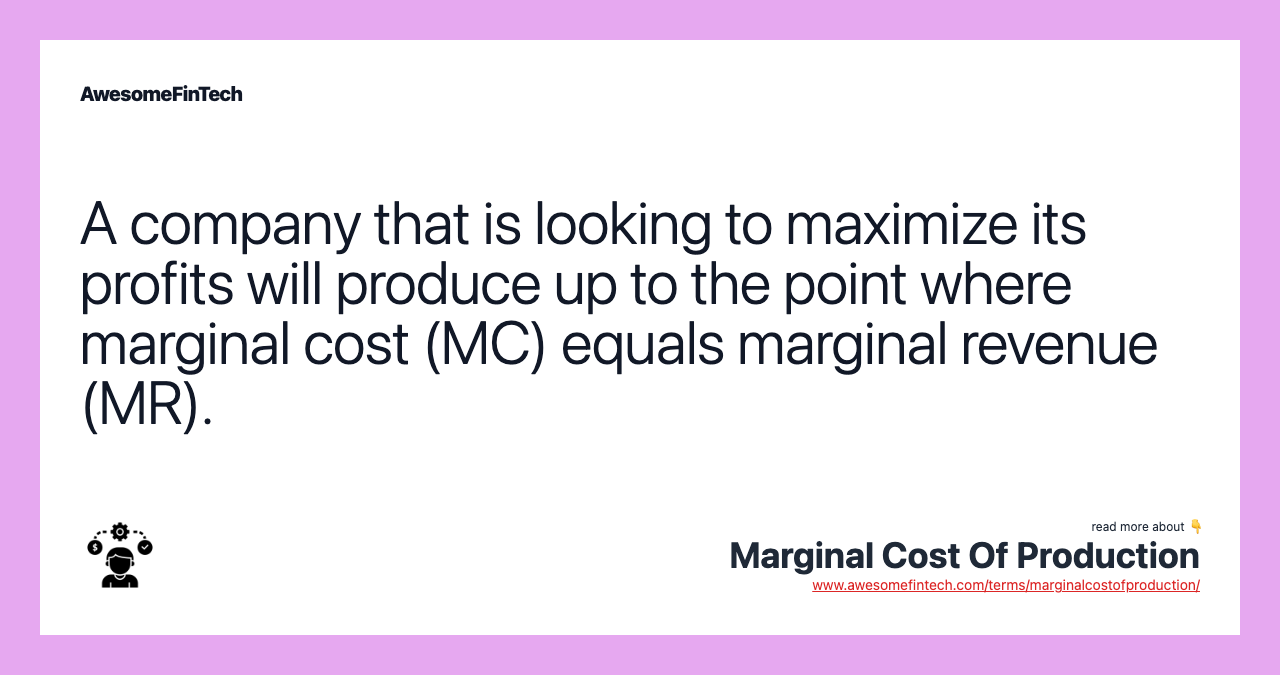 Marginal cost is an important factor in economic theory because a company that is looking to maximize its profits will produce up to the point where marginal cost (MC) equals marginal revenue (MR). Beyond that point, the cost of producing an additional unit will exceed the revenue generated.