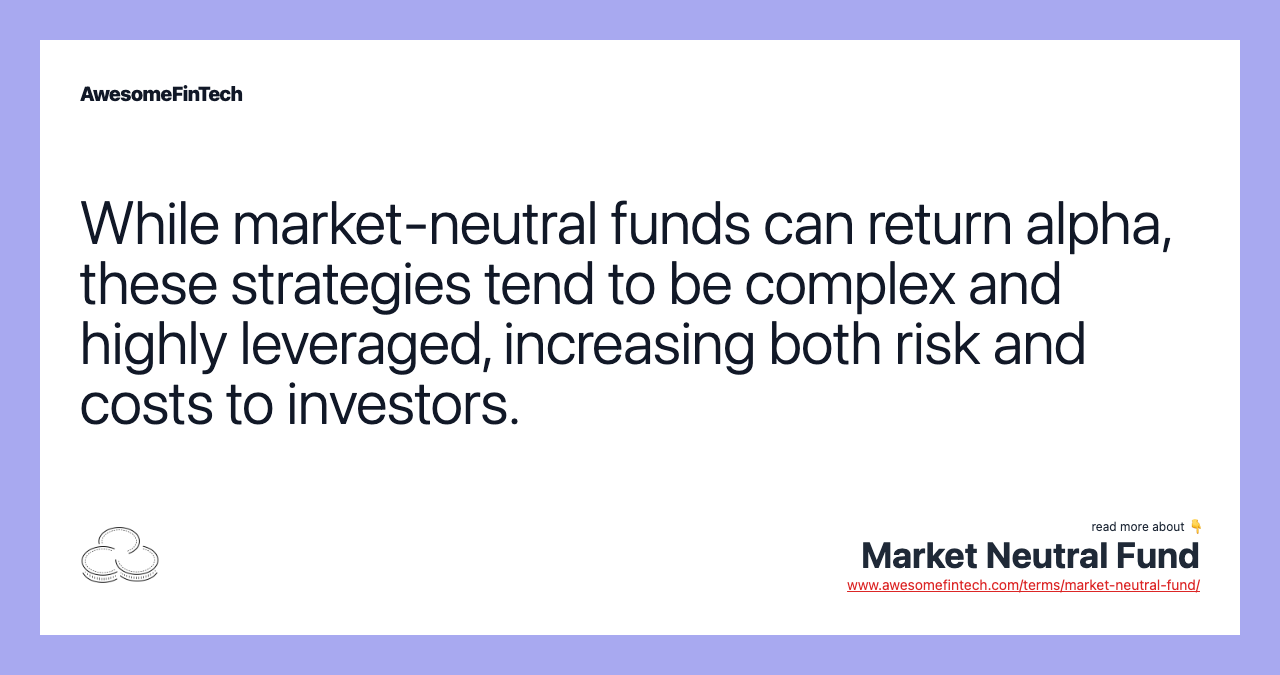 Market-neutral funds can be high-risk since their investment strategies rely on the use of leverage, short selling, and arbitrage to achieve the desired outcomes. Expected returns can range broadly for these funds depending on the tactics deployed. They are often seen as a potential option for mitigating risk in downward trending markets since they generally offer returns that beat money market holdings. However, some fund managers have historically had greater success achieving returns of benchmark indexes such as the S&P 500.