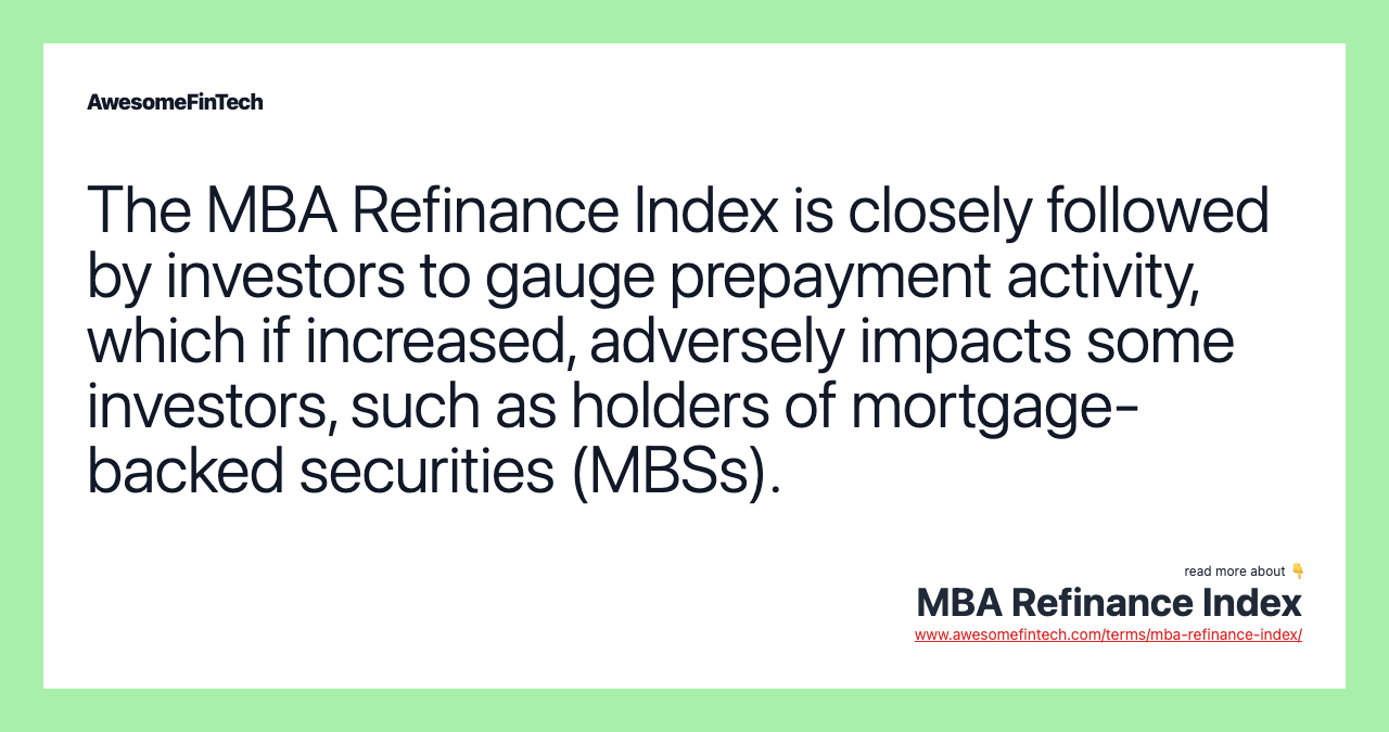 When the Refinance Index indicates an increase in refinancing activity, it can be bad news for investors of mortgage-backed securities (MBS). Homeowners who refinance are prepaying their original mortgages. Mortgage investors then lose the mortgages that are at a higher interest rate and see them replaced by mortgages that incur a lower interest payment.