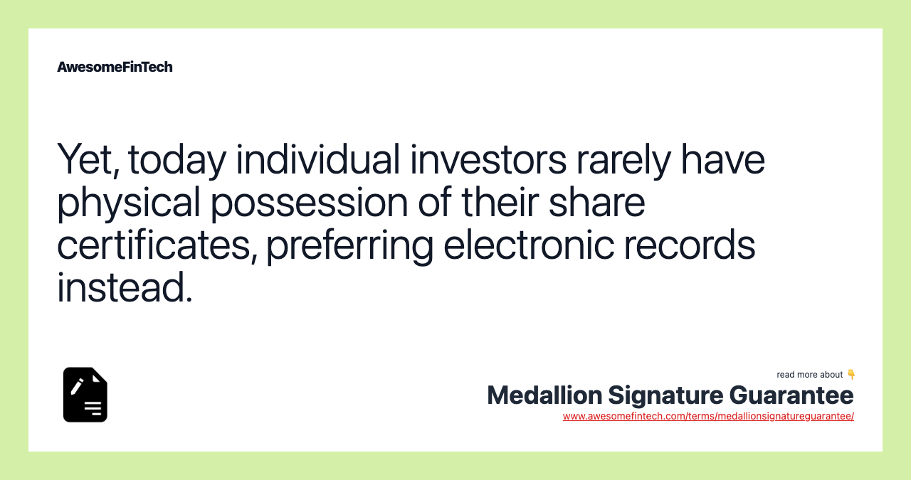 Today individual investors rarely have physical possession of their share certificates, preferring electronic records instead.