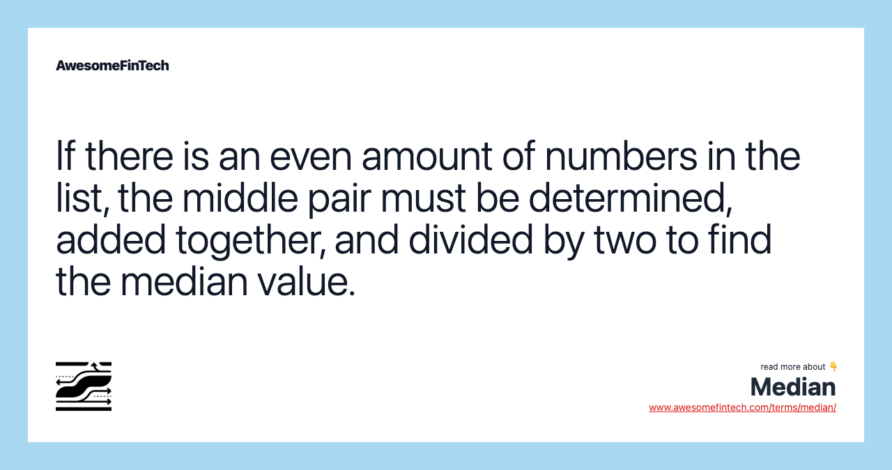 For example, in a data set of {3, 13, 2, 34, 11, 26, 47}, the sorted order becomes {2, 3, 11, 13, 26, 34, 47}. The median is the number in the middle {2, 3, 11, 13, 26, 34, 47}, which in this instance is 13 since there are three numbers on either side.
