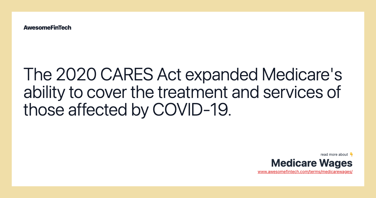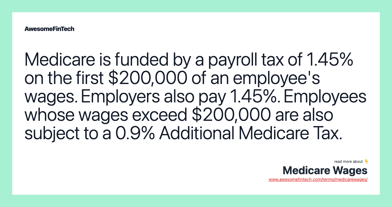Table of Contents What Are Medicare Wages? Understanding Medicare Wages Medicare Tax for the Self-Employed The CARES Act of 2020 Similar to the other U.S. payroll tax, Social Security, the Medicare tax is used to fund the government's Medicare program, which provides subsidized healthcare and hospital insurance benefits to people ages 65 and older and the disabled. Medicare and Social Security taxes are levied on both employees and employers under the Federal Insurance Contributions Act (FICA). Medicare is funded by a payroll tax of 1.45% on the first $200,000 of an employee's wages. In 2021, the Medicare tax on a self-employed individual’s income is 2.9%, while the Social Security tax rate is 12.4%. The maximum Social Security tax for self-employed people in 2021 is $17,707.20. Special Considerations Medicare wages are employee earnings that are subject to a U.S. payroll tax known as the Medicare tax. Table of Contents What Are Medicare Wages? Understanding Medicare Wages Medicare Tax for the Self-Employed The CARES Act of 2020