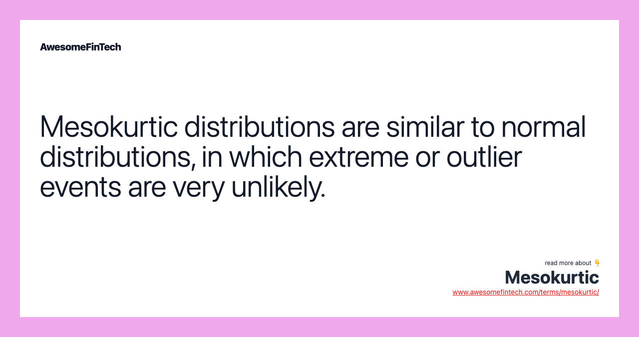 Mesokurtic is a statistical term used to describe the outlier characteristic of a probability distribution in which extreme events (or data that are rare) is close to zero. A mesokurtic distribution has a similar extreme value character as a normal distribution.