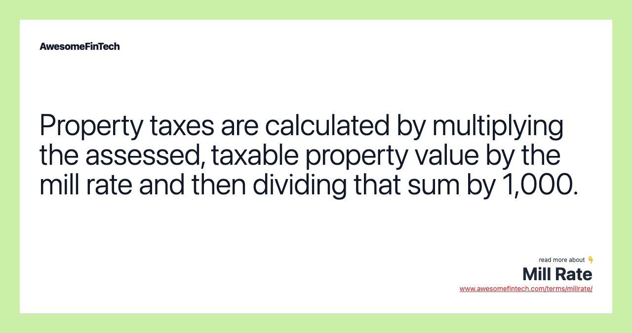 The mill rate is the amount of tax payable per dollar of the assessed value of a property. The mill rate is based on "mills." It is a figure that represents the amount per $1,000 of the assessed value of the property, which is used to calculate the amount of property tax.