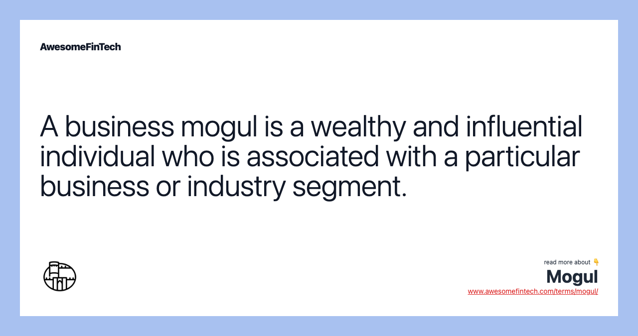 A mogul is defined as a person who possesses a great deal of power, influence, or wealth. In business, a mogul is often associated with a person who dominates an enterprise or industry. Moguls tend to be founders or CEOs of important corporations. Mogul is sometimes used synonymously with "tycoon".