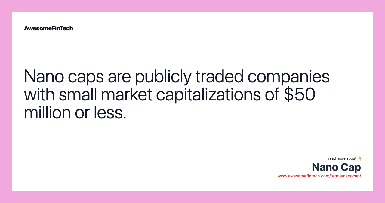 Nano cap refers to small, publicly traded companies with a market capitalization below $50 million and is as small as you can get in terms of market capitalization.