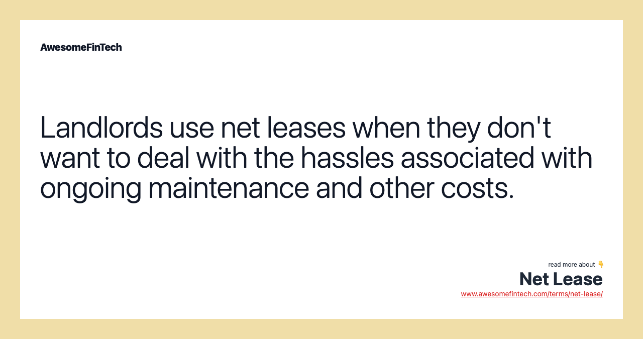 These lease agreements are a popular tool for commercial real estate investors who buy properties for the income and do not want the headaches of arranging maintenance, paying municipal taxes, and so on. Property owners use net leases to shift the burden of managing taxes, insurance, and fees to the tenant. Although the owner and/or lessor may charge less overall as a result, they no longer have to worry about the day-to-day administration of that property.