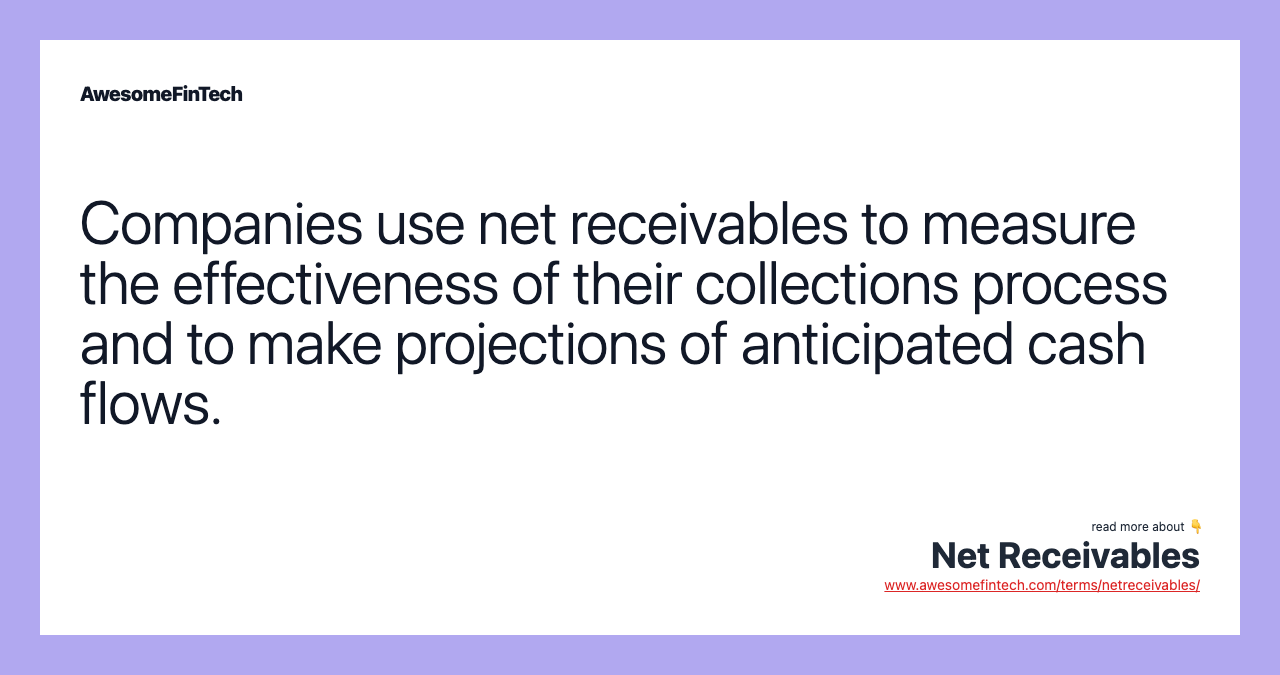 Companies use net receivables to measure the effectiveness of their collections process. They also utilize it when making forecasts to project anticipated cash inflows.
