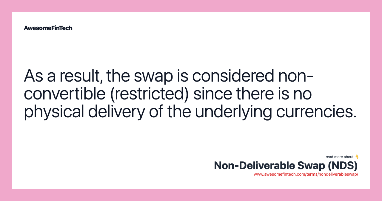 A non-deliverable swap (NDS) is a variation on a currency swap between major and minor currencies that is restricted or not convertible. This means that there is no actual delivery of the two currencies involved in the swap, unlike a typical currency swap where there is physical exchange of currency flows. Instead, periodic settlement of a NDS is done on a cash basis, generally in U.S. dollars.