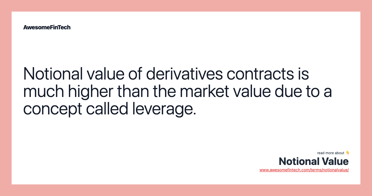In market parlance, notional value is the total underlying amount of a derivatives trade. The notional value of derivative contracts is much higher than the market value due to a concept called leverage.