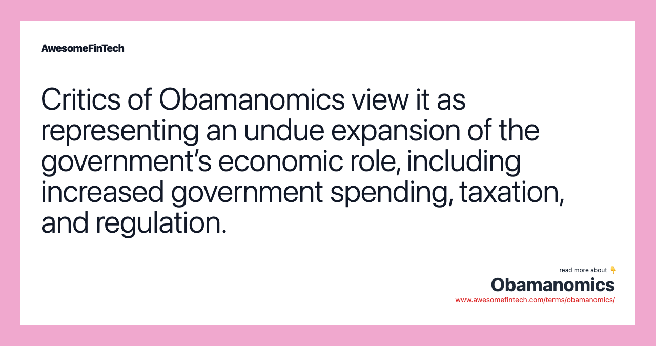 Obamanomics describes the economic policies of the administration of former President Barack Obama, with the term combining "Obama" and "economics." For supporters of Obamanomics, the term is often associated with a favorable view of the Obama Administration’s economic stimulus policies. While some commentators use the term Obamanomics in a positive or negative light, many use it to simply refer to the economic policies of President Obama, without any necessarily positive or negative connotations. Critics of Obamanomics view it as representing an undue expansion of the government’s economic role, including increased government spending, taxation, and regulation. The term is commonly associated with the tax policies, healthcare reforms, and economic stimulus programs enacted by the Obama Administration in response to the Great Recession of 2008.