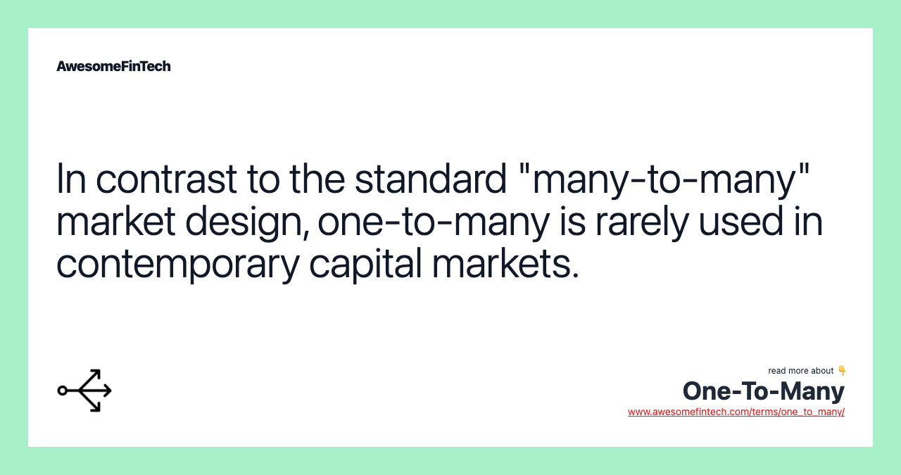 A one-to-many market involves one group or organization transacting with multiple buyers and sellers. However, in contrast to the standard "many-to-many" platform, one-to-many is rarely used in capital markets. The Commodity Exchange Act, for instance, does not recognize one-to-many markets as official trading facilities.