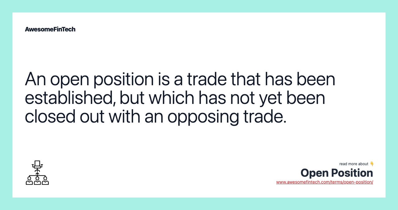 An open position in investing is any established or entered trade that has yet to close with an opposing trade. An open position can exist following a buy, a long position, a sell, or a short position. In any case, the position remains open until an opposing trade takes place.