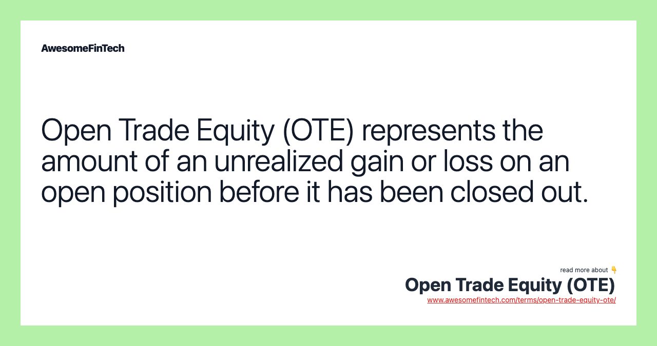 Open Trade Equity (OTE) is the net of unrealized gain or loss on open derivatives positions. Put differently, OTE is the paper gains and losses represented by the current market value and the price paid (or received) for a position. Once the position is closed, the gain or loss will become realized.