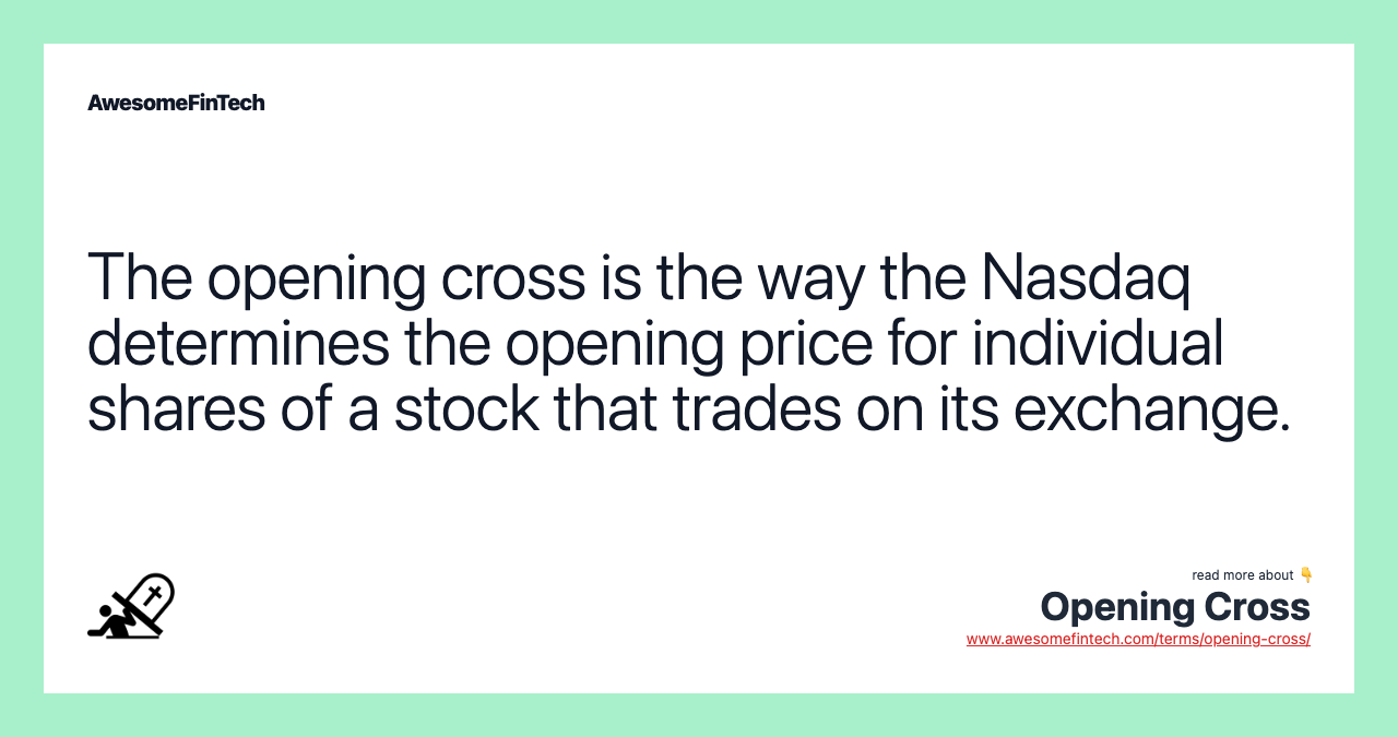 The opening cross is a method the Nasdaq uses to determine the opening price for an individual share of the stocks that trade on its exchange. The opening cross tries to limit such volatility, by reflecting the change in sentiment regarding a stock between the closing price the day before and the opening price in the morning. The opening cross is the way the Nasdaq determines the opening price for individual shares of a stock that trades on its exchange. The opening cross is a method the Nasdaq uses to determine the opening price for an individual share of the stocks that trade on its exchange. The process is undertaken to reflect the change in sentiment (and share price) regarding a stock between the closing of the market yesterday and the opening of the market today.