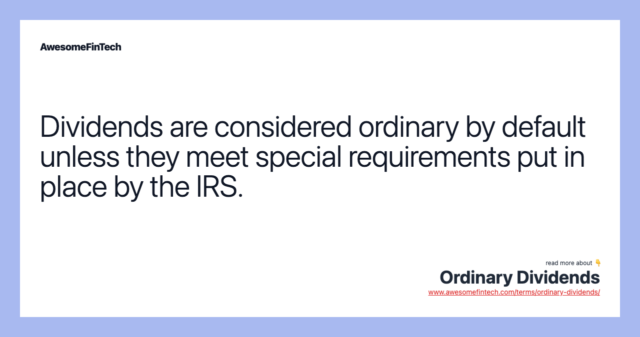 Dividends are considered "ordinary" by default, although there are cases when a dividend may be classified as "qualified" because it meets specific criteria. Ordinary dividends are taxed as ordinary income, while qualified dividends are taxed at the lower capital gains rate.