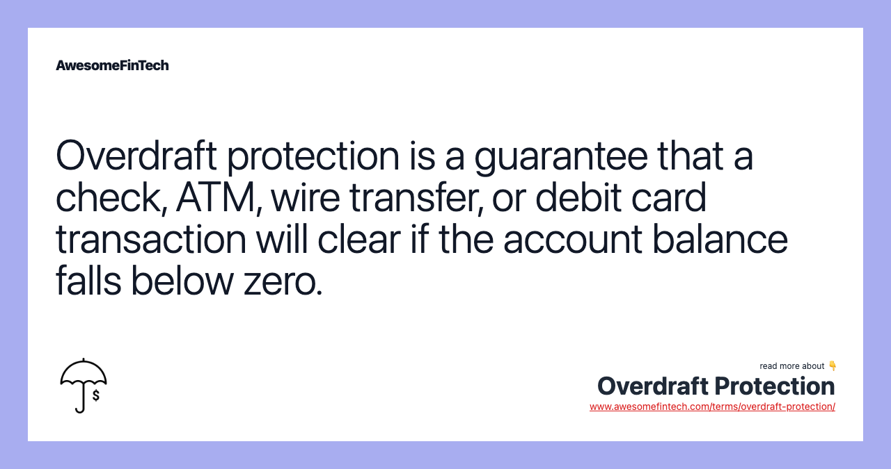 Overdraft protection is an option offered in bank accounts that prevents check, ATM, or debit card transactions, as well as wire and electronic transfers, from causing the account's balance to fall below zero and triggering an overdraft fee or a non-sufficient funds (NSF) fee. With overdraft protection, a bank will cover a shortfall and charge for the service with an overdraft fee, or “courtesy fee,” so the transaction goes through successfully.