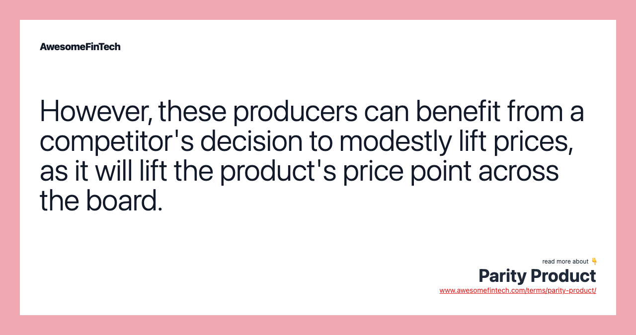 A business selling a parity product will in most cases be unable to command premium pricing for it, because of the substitution effect. If the business raises its price while competitors do not raise theirs, consumers will buy less of its product and instead purchase the competing parity products.