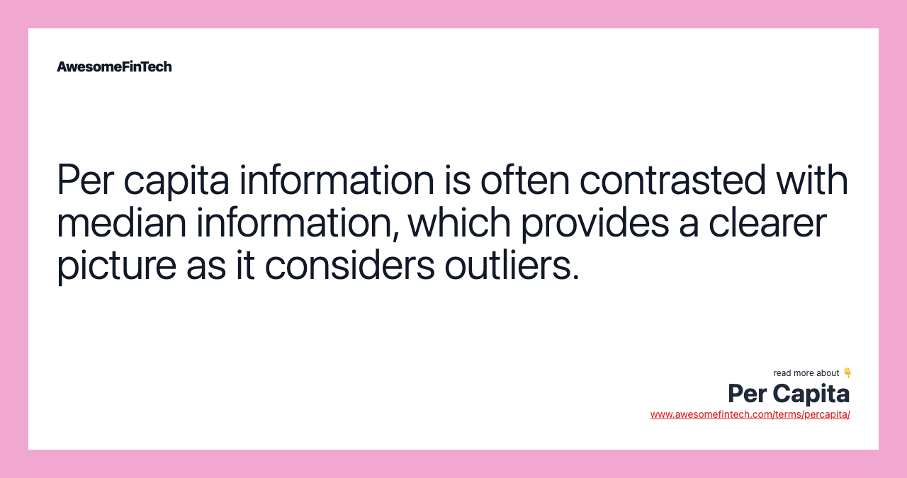 In contrast to per capita measures, median numbers, such as those for income, provide an arguably more accurate picture of how much the residents of a particular country or area are likely to earn.