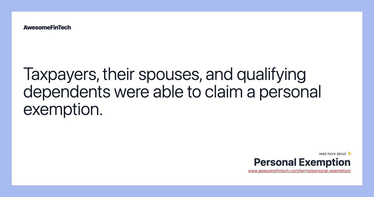 The personal exemption was available to every taxpayer who could not be claimed as a dependent on someone else’s taxes. For example, a college student who received more than half of their financial support from their parents could not claim the exemption for him or herself because his or her parents could claim him or her as a dependent. Whether or not the parents actually did so was irrelevant; because they could, the student would have been ineligible for the personal exemption.
