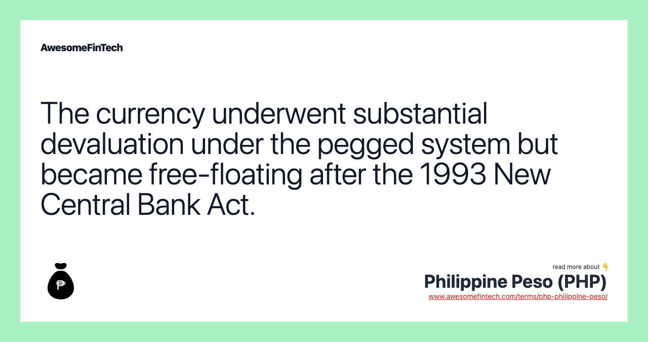 The New Central Bank Act of 1993 set the Philippine peso on a path to being a free-floating currency. While this led the exchange rate to become substantially higher than the earlier pegged levels, the move to a free-floating currency has brought stability and the black market for the currency (which nearly always reflected a lower value of the ₱ than official channels) has ceased to exist.