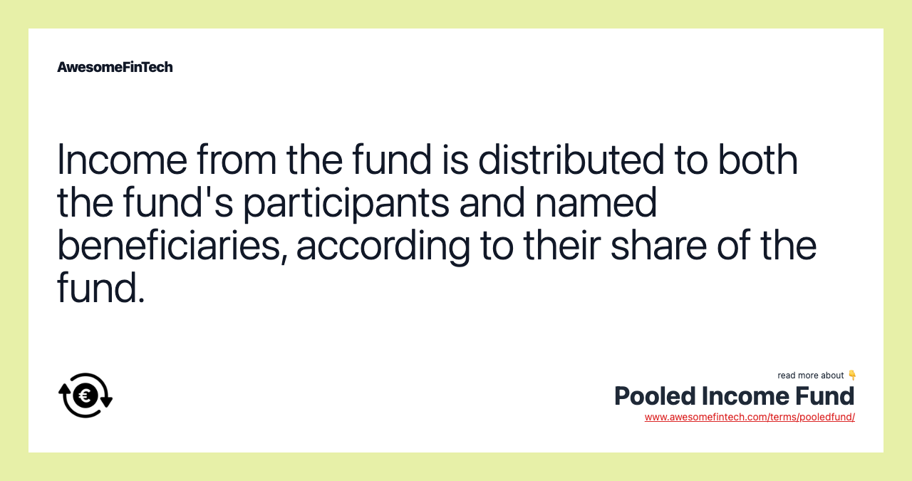 A pooled income fund is a type of charitable trust. A pooled income fund is a mutual fund composed of gifts that are pooled and invested together. Income from the fund is distributed to both the fund's participants and named beneficiaries, according to their share of the fund. If you are a donor to the fund, you choose the other income recipients to receive quarterly payments for life. Upon your death, the value of the assets will be transferred to the beneficiaries.