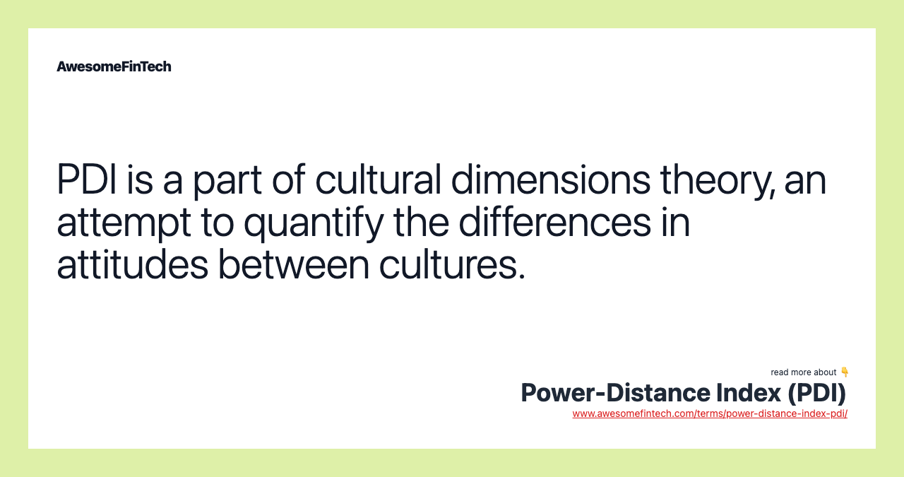 The power-distance index (PDI) is a measurement of the acceptance of a hierarchy of power and wealth by the individuals who make up the general population of a nation, culture, or business. The power-distance index (PDI) is a measurement of the acceptance of a hierarchy of power and wealth by the individuals who make up the general population of a nation, culture, or business. Based on these and other results, Hofstede determined that there are six distinct dimensions to every culture: power distance, uncertainty avoidance, individualism versus collectivism, short term versus long term, masculinity versus femininity, and self-restraint versus indulgence. The power-distance index is one component of Hofstede’s cultural dimensions theory, which was the first attempt to quantify the differences among cultures. The power-distance index measures the degree to which the members of a group or society accept the hierarchy of power and authority.