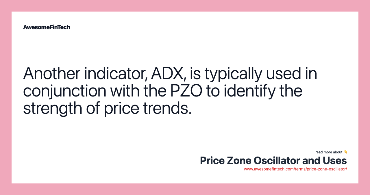 Most traders use the Price Zone Oscillator in conjunction with other technical indicators or chart patterns, such as the Average Directional Index (ADX), which measures the potential strength of trends. The author's original article described several buy and sell guidelines based on using the PZO and ADX together.