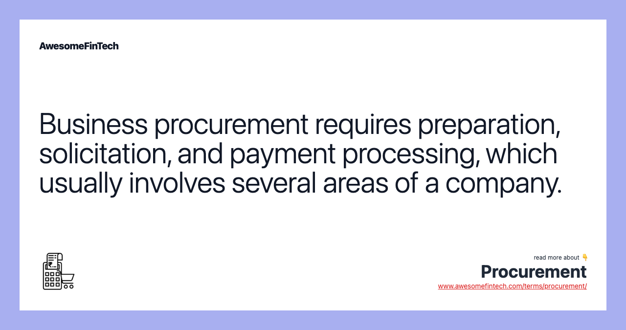 Table of Contents What Is Procurement? A chief procurement officer can oversee the establishment of procurement standards, work with accounts payable to ensure procurement standard integration and efficient payment, and serve on procurement teams making procurement decisions when there are multiple competitive bids. Overall, procurement costs will be integrated into the financial accounting of a business, as procurement involves acquiring goods and/or services for the revenue goals of the business. Competitive bidding is usually a part of most large scale procurement processes involving multiple bidders. Procurement and procurement processes can require a substantial portion of a company’s resources to manage. Service-based companies provide services as their primary revenue generator so they do not necessarily rely as heavily on a supply chain for inventory although they may need to purchase goods for technology-based services.